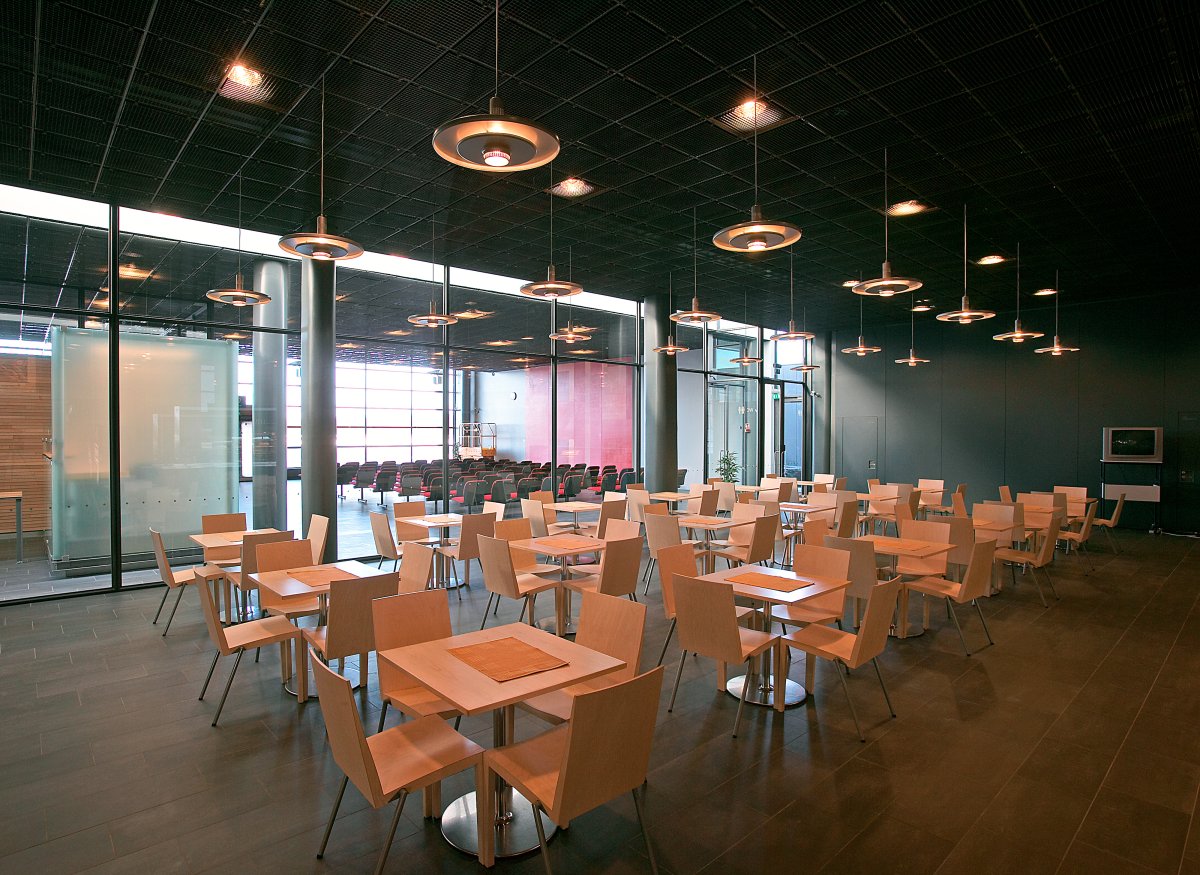 The oldest terminal was extended for the first time in 1988, when a simple one-storey pavilion was built. The programme was limited, but the small building was given spaciousness by a large rooflight and the glass tower of the cafe. The graphite grey ceramic tile used in the facade was developed for the terminal. On both sides of the building in front of the tiled exterior walls, there are long steel-structured canopies, which serve a functional purpose but also lighten the appearance of the facade.