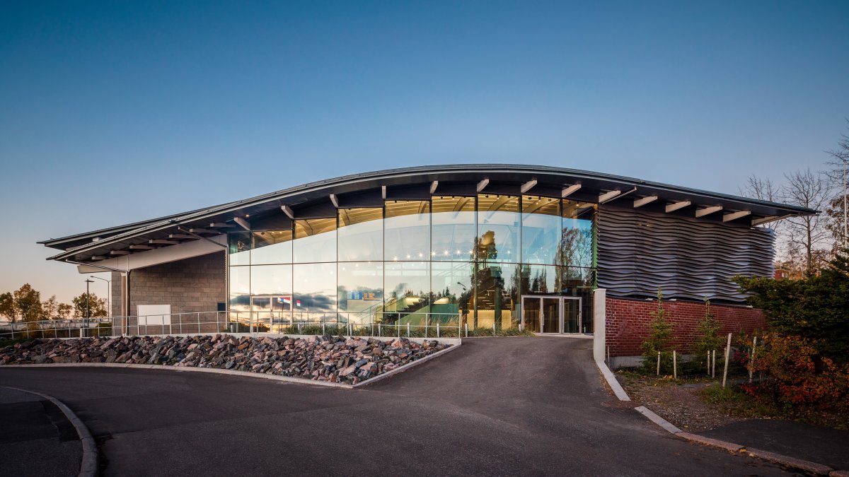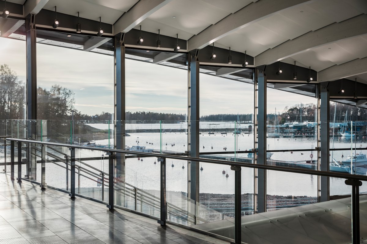 The free-form roof of the Koivusaari station compares with an upside down wooden vessel. The principal exterior cladding materials are acid-proof steel, patinated solid zinc sheet, glass and natural stone. The floor and walls of the main entrance are red granite, which is the most common stone of the shoreline rocks of the area. The exposed roof beams are wood structures, and the roof is supported by a massive primary beam with a curve at one end. The upper parts of the long side walls of the platform are composed of spotlighted wave-like “baleens”, which have both an atmospheric and an acoustic function. The ceiling is asymmetric in every direction, and a work of art reflecting the sea is planned there. The flooring of the platform is on-site cast, polished concrete mosaic. Koivusaari is the only undersea metro station in the world and its escalator is the longest in Finland. The platform is under the Vaskilahti bay at level –30.00.