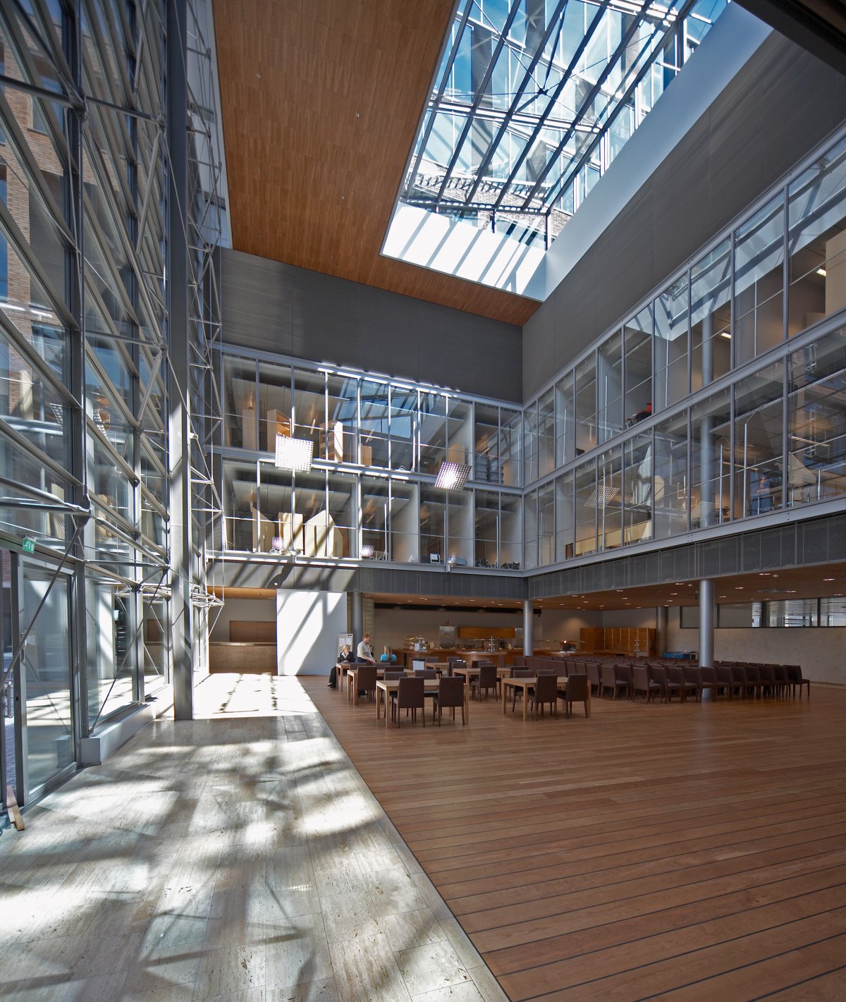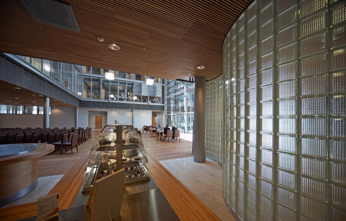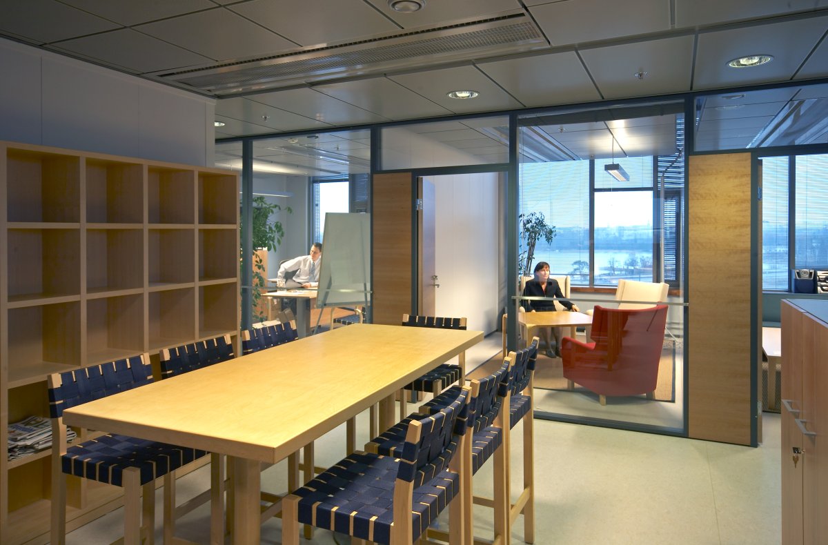The working areas of the building are universal and flexible, emphasising openness and interaction. The building has many users, the major ones being Ahlström, Alko, Comptel and Fennovoima. They all use a shared restaurant and conference centre. The waterfront promenade is enlivened by ground-level exhibition spaces. Parking is behind these in the basement, in a section of a public parking facility.