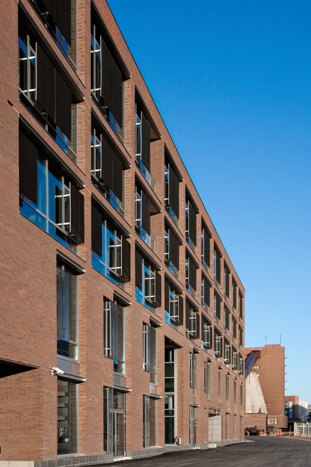 The exterior is dominated by red brick, both in surfaces and as a tectonic structure in the manner of the old industrial buildings of the area. The thermal load of the large windows is compensated by metal screens and special glass. The detailed plan and the strict interpretation of it by the building control authorities required that two top floors were to be clad entirely with glass.