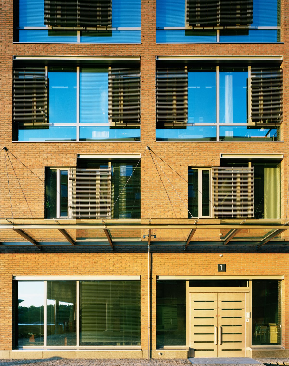 For reasons of energy efficiency, a sun-shading grille has been placed in front of the window glazing…The grilles and glass surfaces form a varied play, which lends the building a distinctive appearance…The darkish red brick, with flush pointing, enlivens the facade surface.