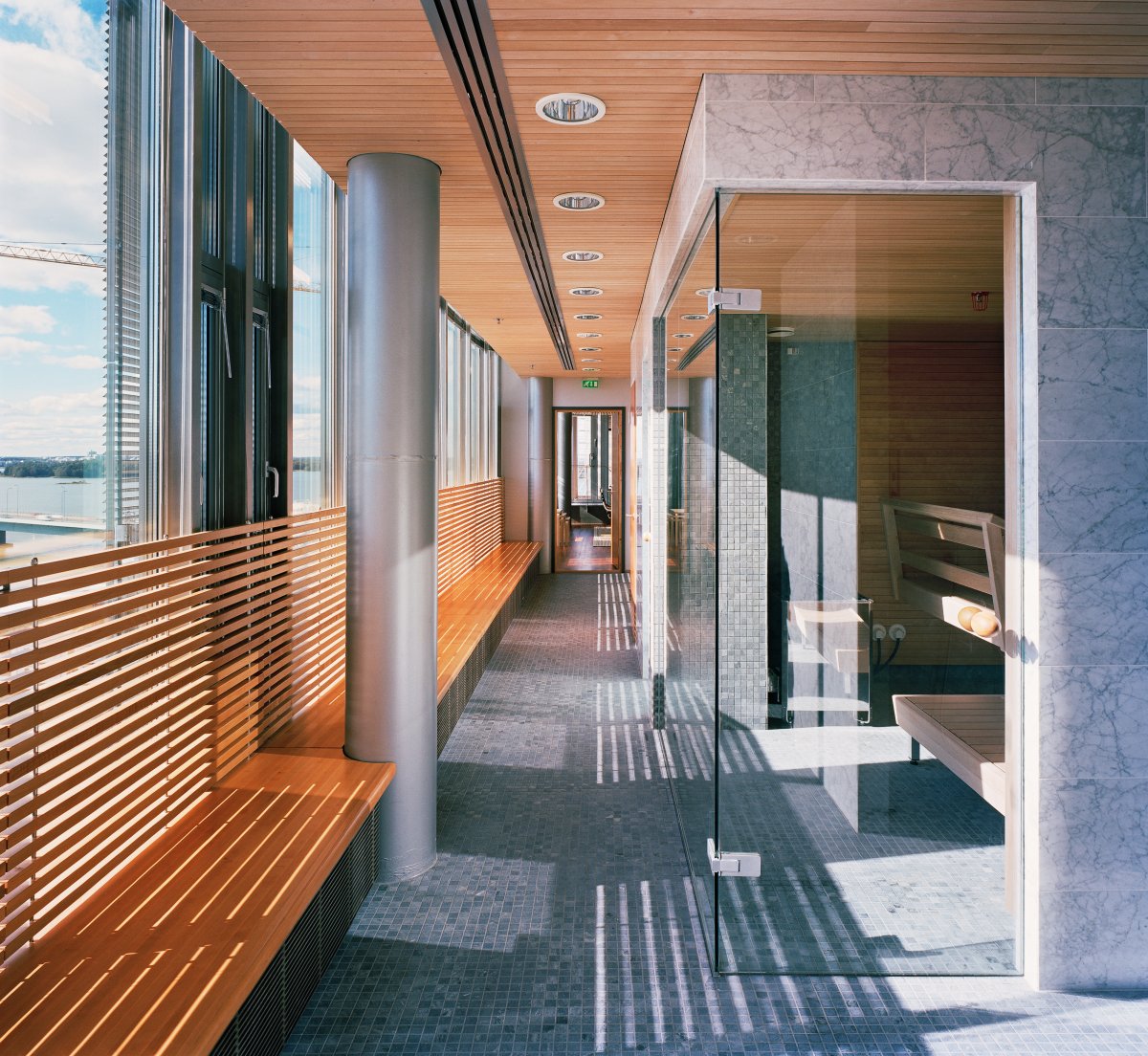 The different floors wind around a central space, which opens up to a square on the northern side. The strait in front of the building and views over the Seurasaarenselkä bay towards Keilaniemi are powerfully present in the spaces. The building has a steel skeleton with lightweight elements of steel in the blank parts of exterior walls. In the architectural expression, this material is most clearly visible in the wind braces of the high glass wall and the lattices of roof lights. The intermediate floors are hollow-core slabs.