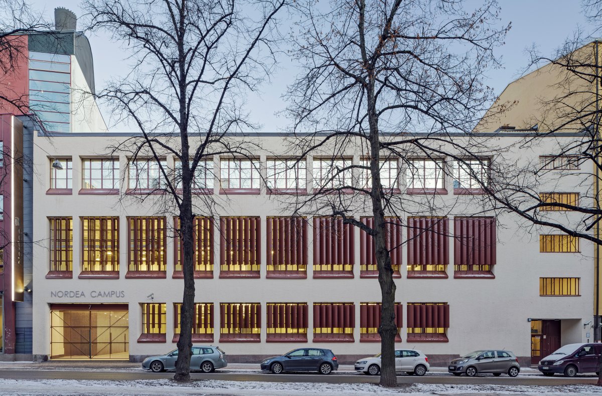 The harbour railway once gave rise to an industrial zone built here on the basis of the previous detail plan of 1901. Valuable parts of this building stock are existent on the Nordea block. The oldest of them is the sugar and syrup factory built in 1898 to designs by K. F. Andersson. It was bought in 1916 by Juho Merivaara, owner of an iron bed factory, who commissioned an extension design from Väinö Vähäkallio. The design comprised an office building and three factory wings, of which only one was built. In 1928 the building was occupied by the Sisu-Auto car business, which operated there until the end of 1985. The HOK bakery designed by Erkki Huttunen was completed in 1937. The KOP bank built its computer centre on Aleksis Kiven katu 5 in 1962 and later extended it by a copper clad building at the eastern end of the block (Ilmo Valjakka, 1972–73).