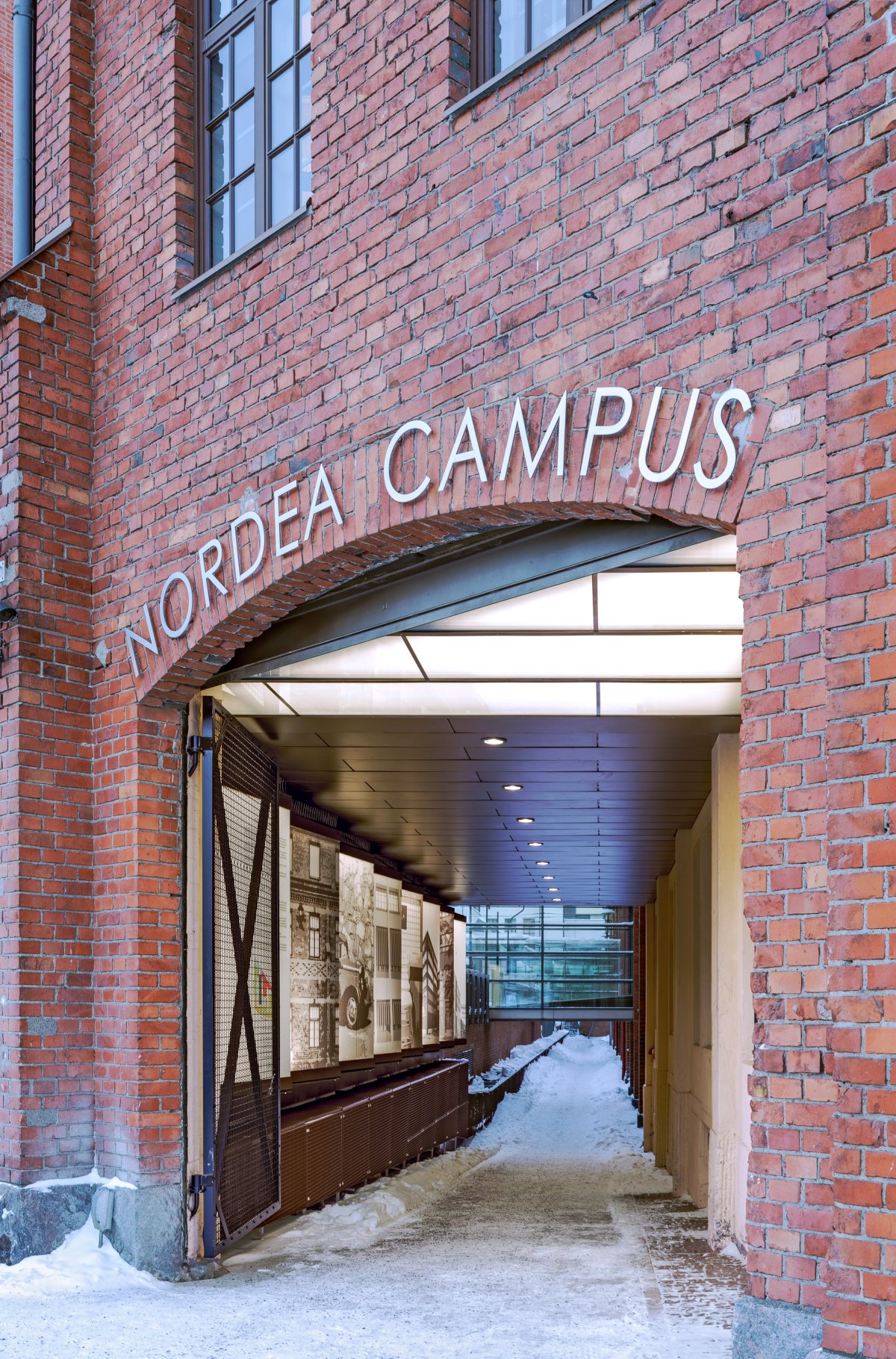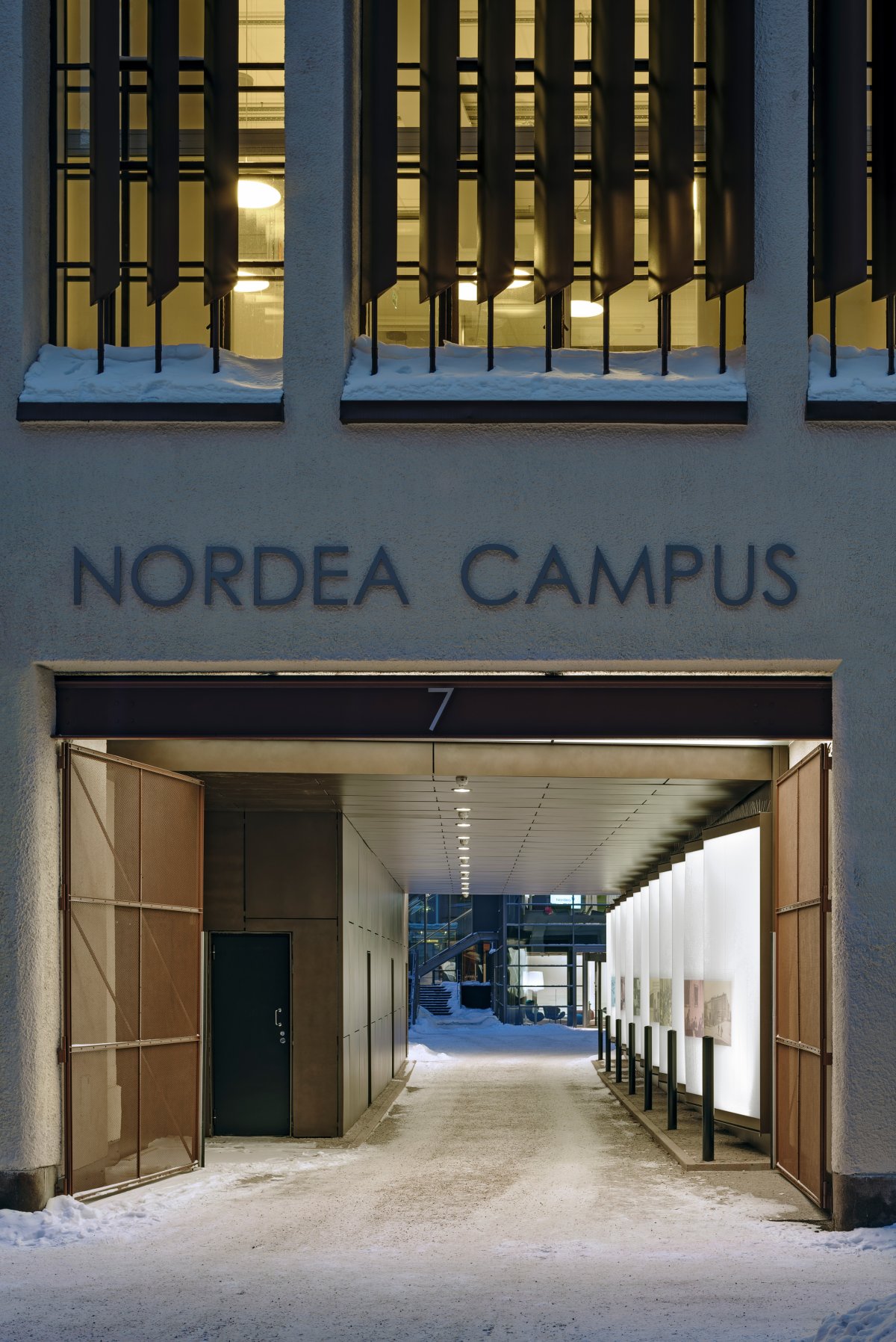 In 2014, Nordea decided on a further development of the city block. The main entrance and customer traffic were centralised instead of the former three entrances, with the aim to achieve an open block structure and outward orientation. The courtyards formerly mainly used for parking and maintenance were refurbished to serve pedestrian traffic as welcoming urban spaces with finished surfaces, plantings and lighting arrangements. A new entrance lobby was arranged in the courtyard wing of Satamakatu 5, access to the plot being mainly from Aleksis Kiven katu street through the gateway of the former bakery building. The former fire lane flanking the iron bed factory was refurbished as a passage within the block towards Satamaradankatu street. A comprehensive alteration of the restaurant in the iron bed factory building was completed in 2017. Its interior decoration was not included in the architect’s task.