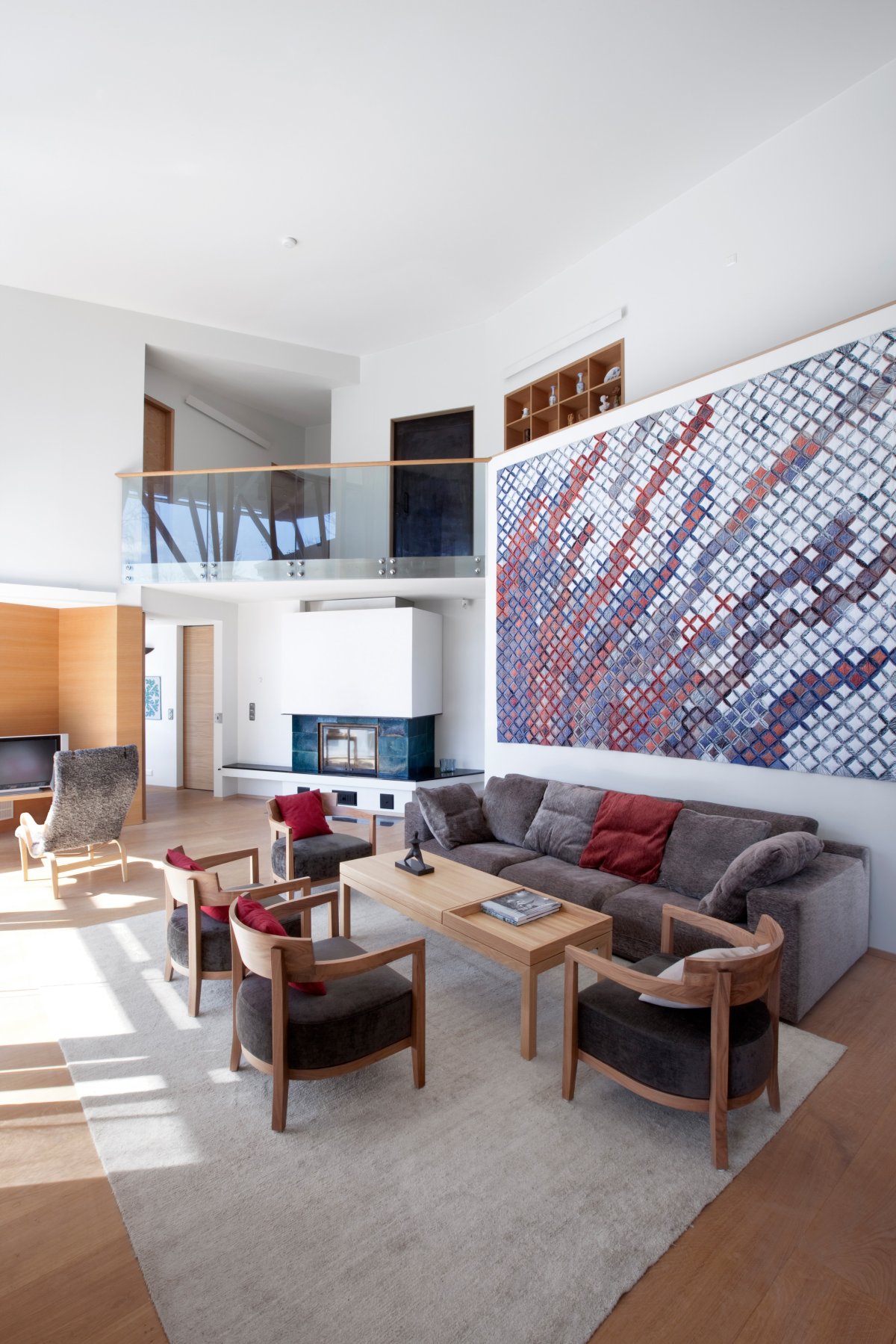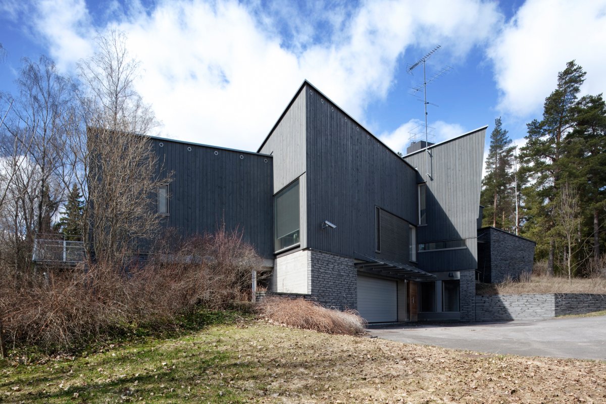 The new villa winds around a terrace and a sheltered courtyard. On one side of the terrace, there is a conservatory providing shelter from the wind. Its floor can be opened in sections, which enables the growing of useful plants to the extent desirable at any point in time. The conservatory is supplied with a long garden table with chairs, so evening gatherings can continue far into the autumn. Stairs and planted terraces descend from the lounge terrace towards the shore. The spaces are on three levels: storage, a hobby room with a loom and baking oven and a garage on the lowest level, living areas, the master’s study and the master bedroom on the entrance level, and additional bedrooms and a sauna on the gallery level.