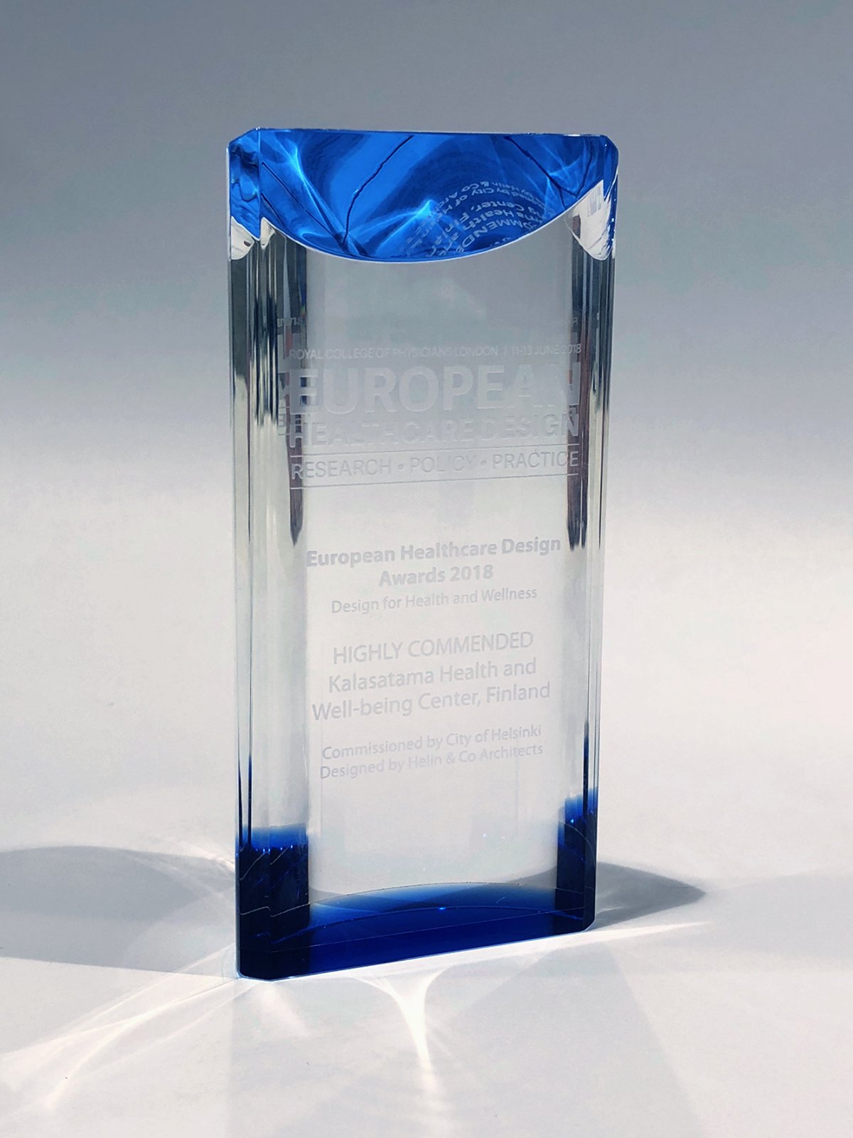 Kalasatama Health and well-being centre received European Healthcare Design – Highly Commended Award. The awards aim to make a significant contribution towards the development of knowledge and standards in the design of healthcare environments around the world. The European Healthcare Design Congress is organised yearly by Architects for Health and SALUS Global Knowledge Exchange.