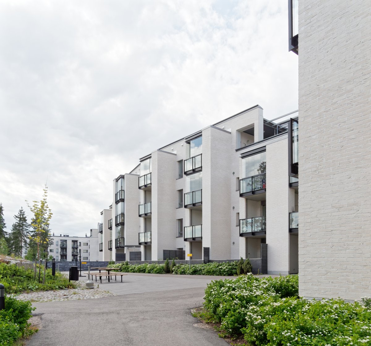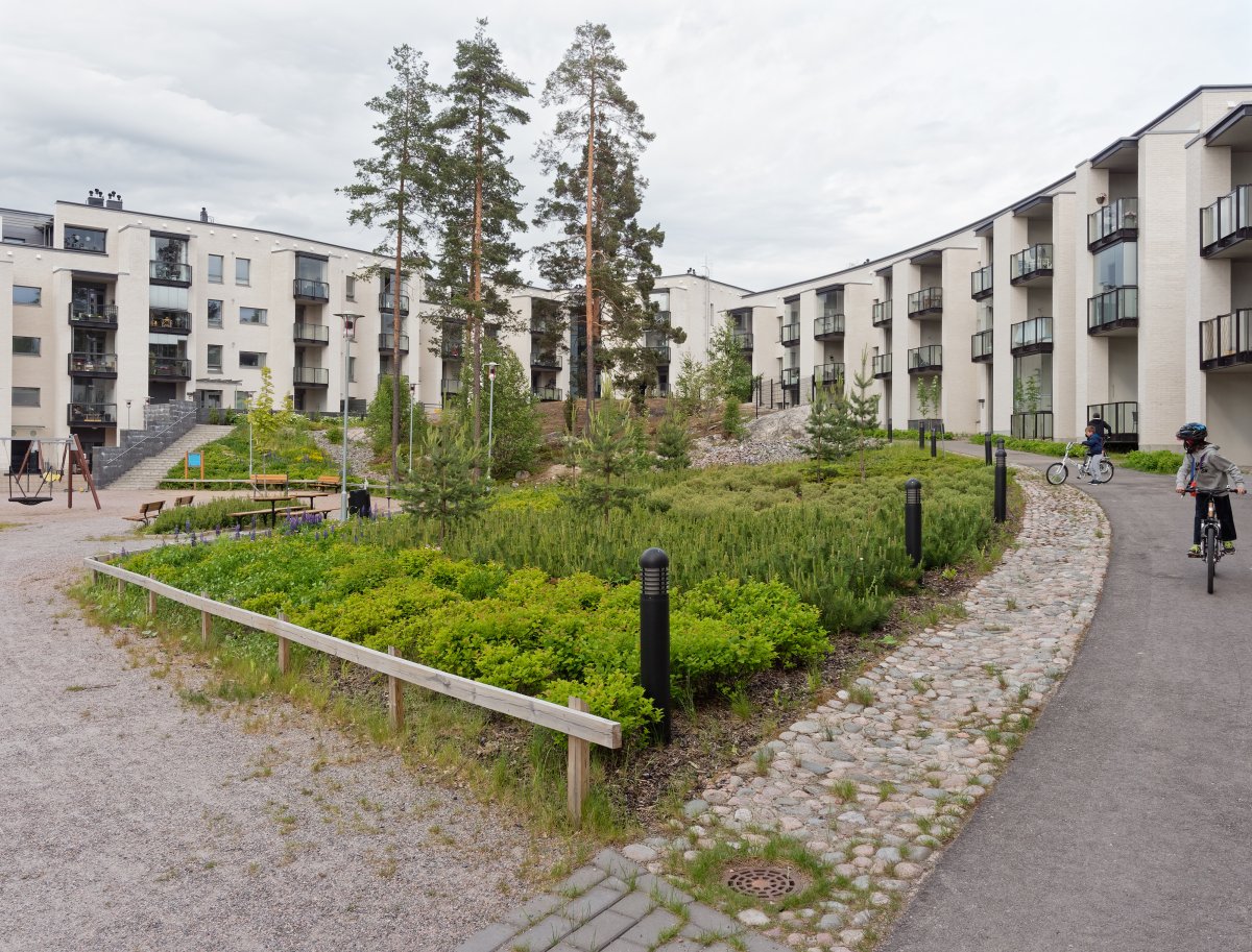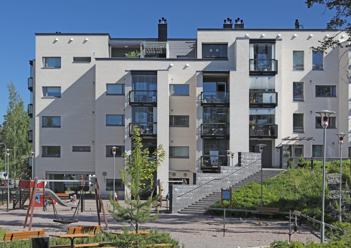 These primary-stingy flats, consisting of both right-of-residence and owner-occupied homes, number 179 in all. In addition to six blocks of flats there are three terraced-house flats. The buildings are on two city blocks with a north-south pedestrian and bicycle passage between them. Energy is saved by heating the buildings with a low-heat hydronic floor heating system, by providing floor heating and ventilation installations with at home/away switches, and by connecting washing machines to hot water. The flats have pellet fireplaces and maintenance systems and the shared saunas have low-carbon pellet stoves. The heat from the stoves is utilised in the heating of shower water (there are no flat-specific saunas). All spaces use district heating, electric fixtures are energy saving, outdoor areas and shared spaces are lit with LED technology, lighting is controlled by motion sensors and energy consumption is monitored. Shading recesses (French balconies) and the courtyard side balconies protect from excessive solar heat.