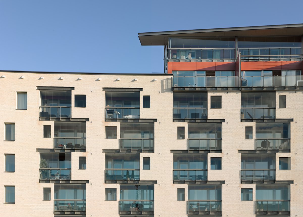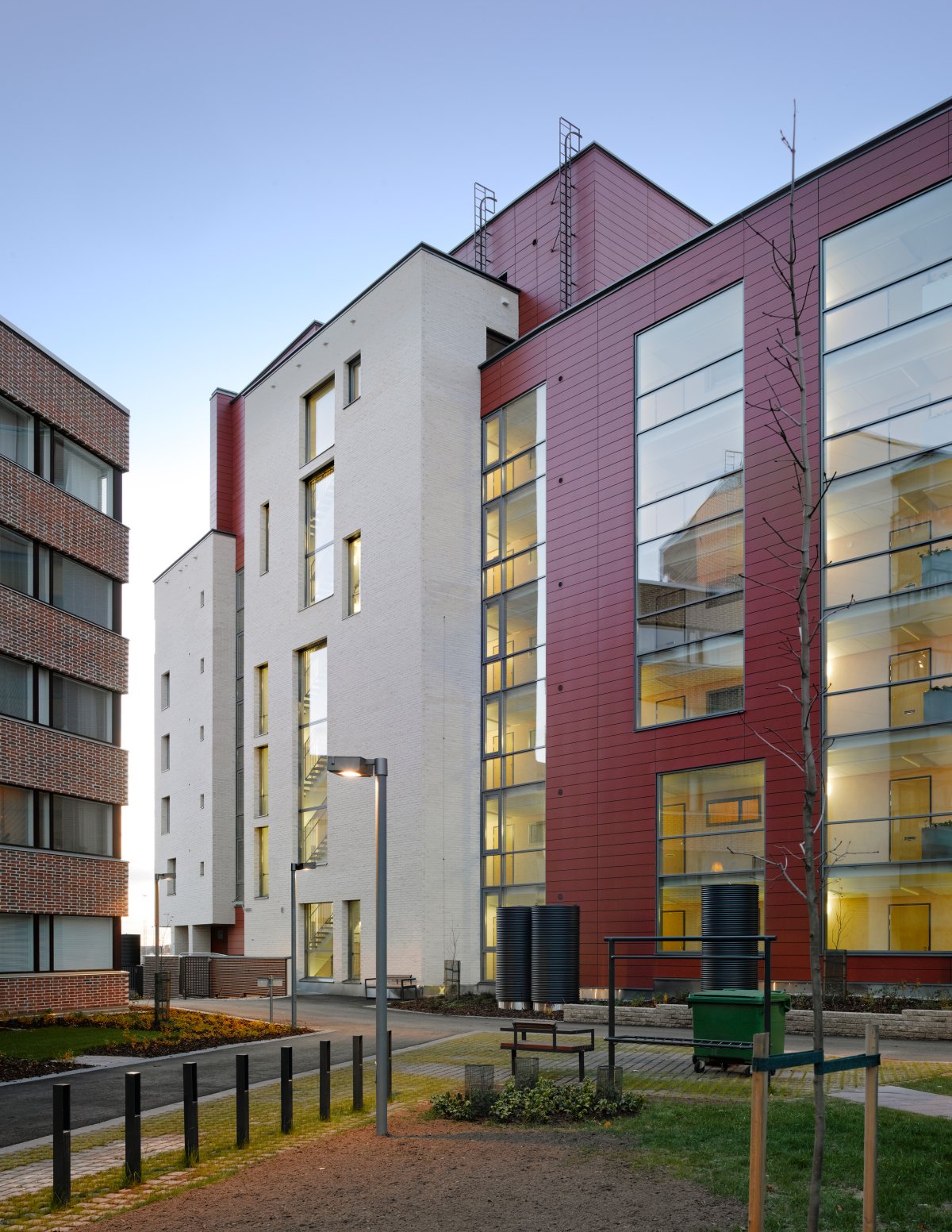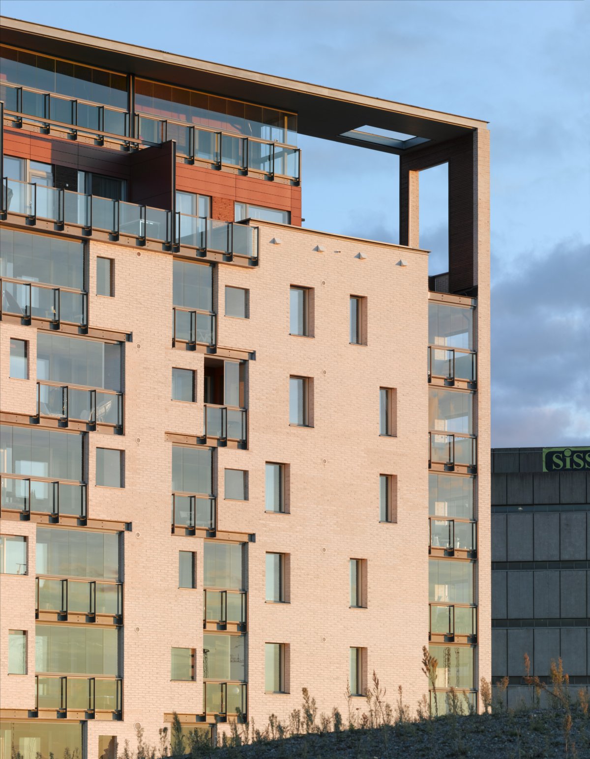The facade facing the park, built of pale mould cast Ruukintiili brick, is articulated with flat-specific balconies and varying openings of their blank parts. The courtyard facade features fibre cement sheeting in caput mortuum red to lend warmth to the private side. Warm colouring continues on the interior walls of access balconies, which are visible from the courtyard through large glass walls.